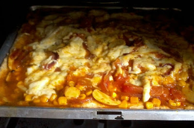 Pizza de cogumelos, milho e molho de tomates acebolado com Mandiokejo