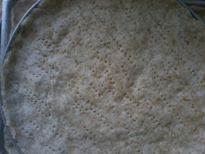 Esticar a massa em duas formas médias untadas com óleo, fazer muitos furinhos nela com um garfo e levar ao forno médio, por 30 minutos (mais 15 depois que adicionar o molho e o queijo).