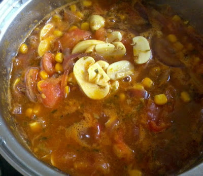 Cortar os tomates em pedaços grandes e juntar ao refogado. Colocar um pouco de água, os temperos, o milho e deixar cozinhar em fogo baixo.